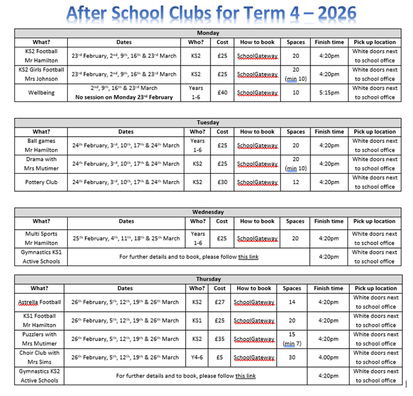 Please see below a timetable of the clubs available for this term.